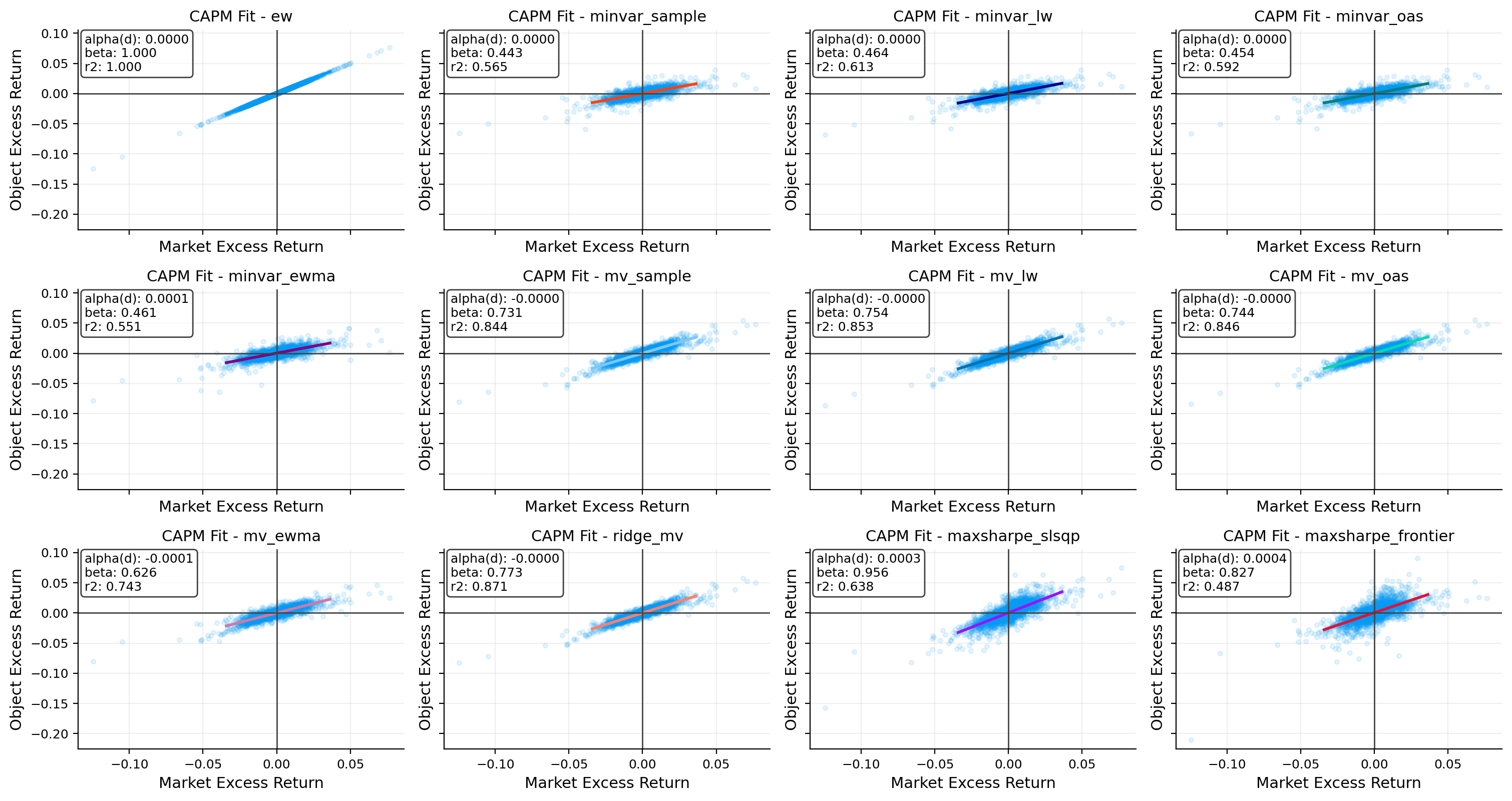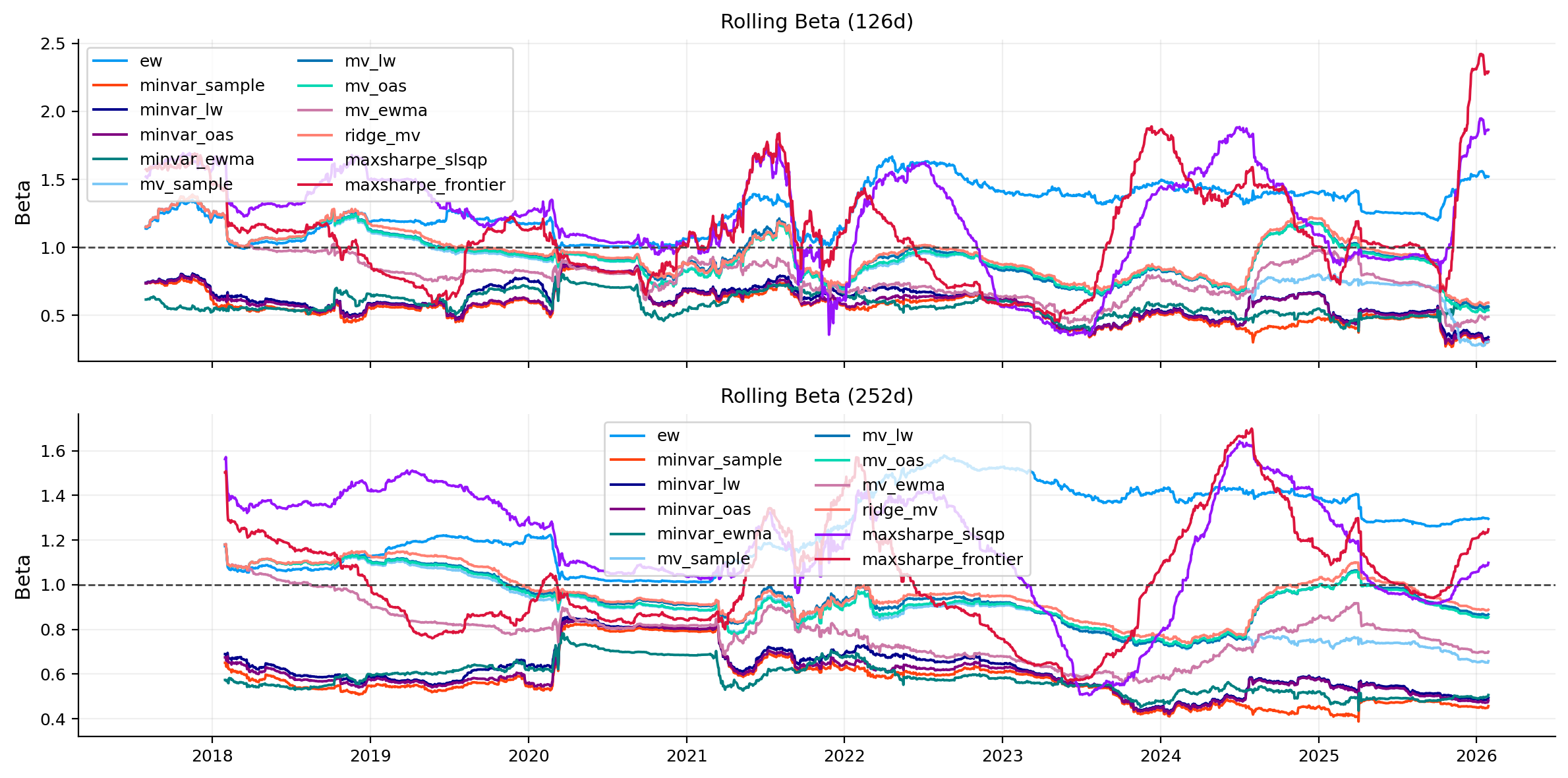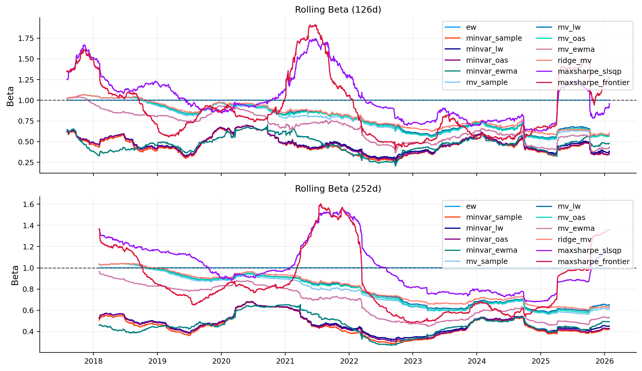- Highest market beta: ew (1.00); lowest: minvar_sample (0.44).