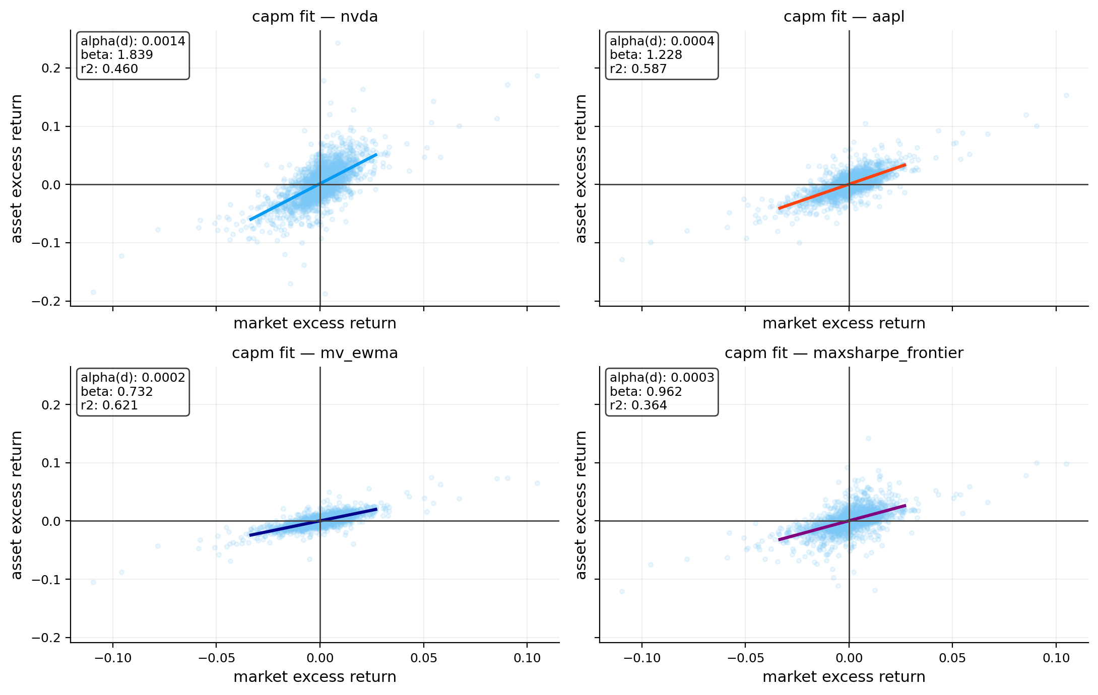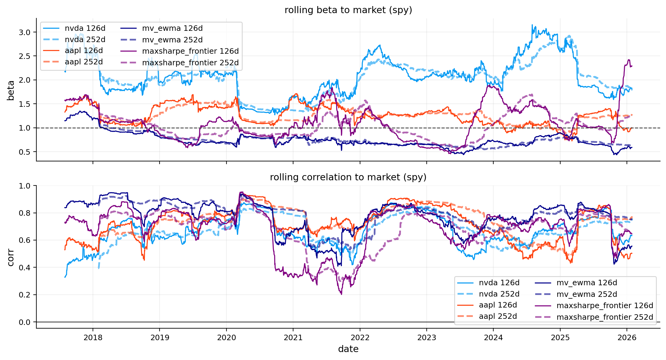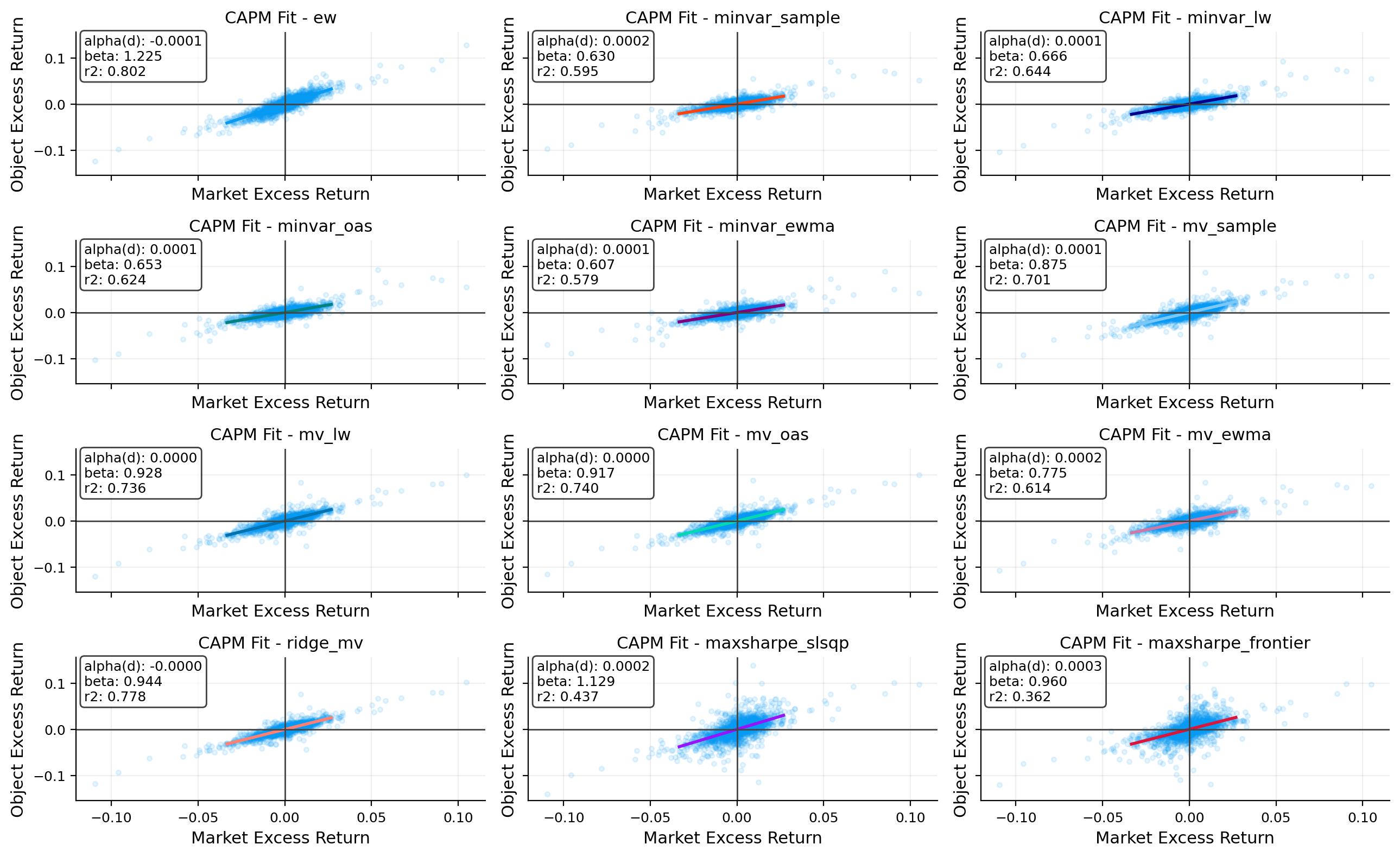 - Highest market beta: ew (1.00); lowest: minvar_sample (0.44).