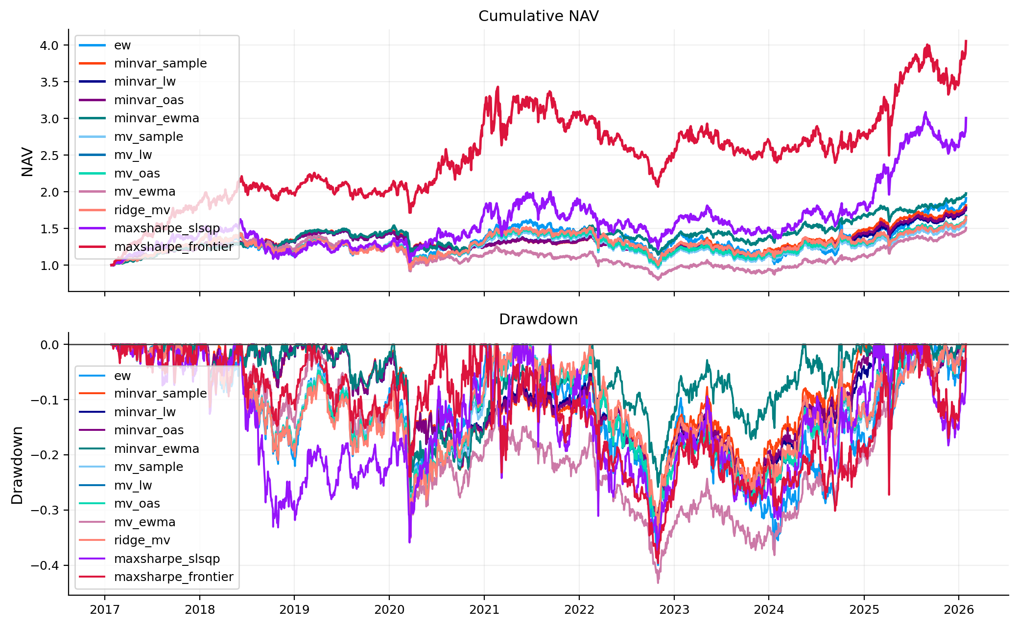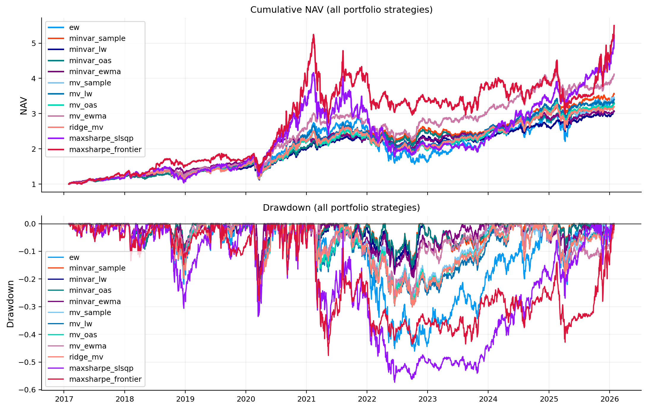 HKEX strategies in report: ['ew', 'maxsharpe_frontier', 'maxsharpe_slsqp', 'minvar_ewma', 'minvar_lw', 'minvar_oas', 'minvar_sample', 'mv_ewma', 'mv_lw', 'mv_oas', 'mv_sample', 'ridge_mv']