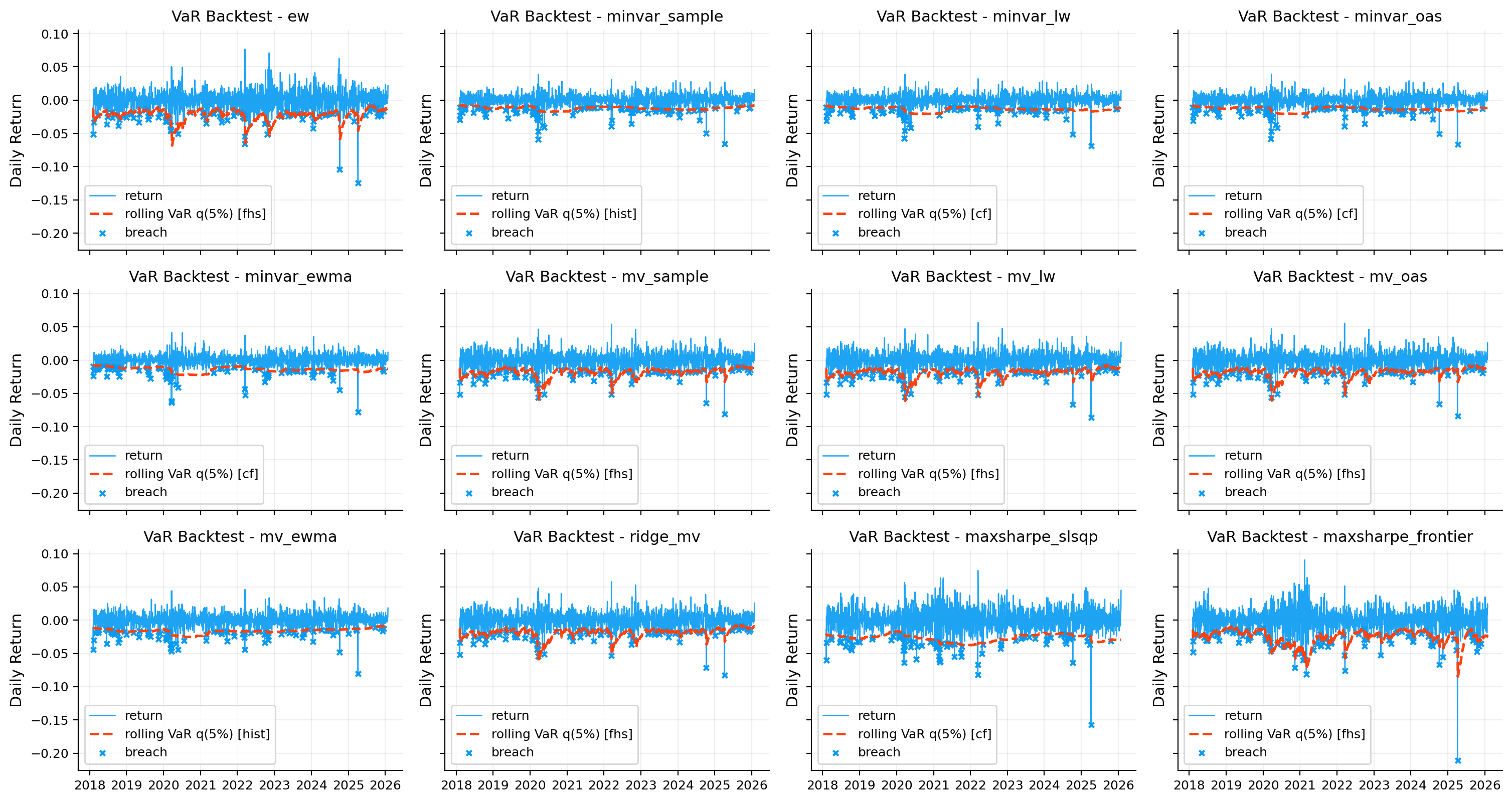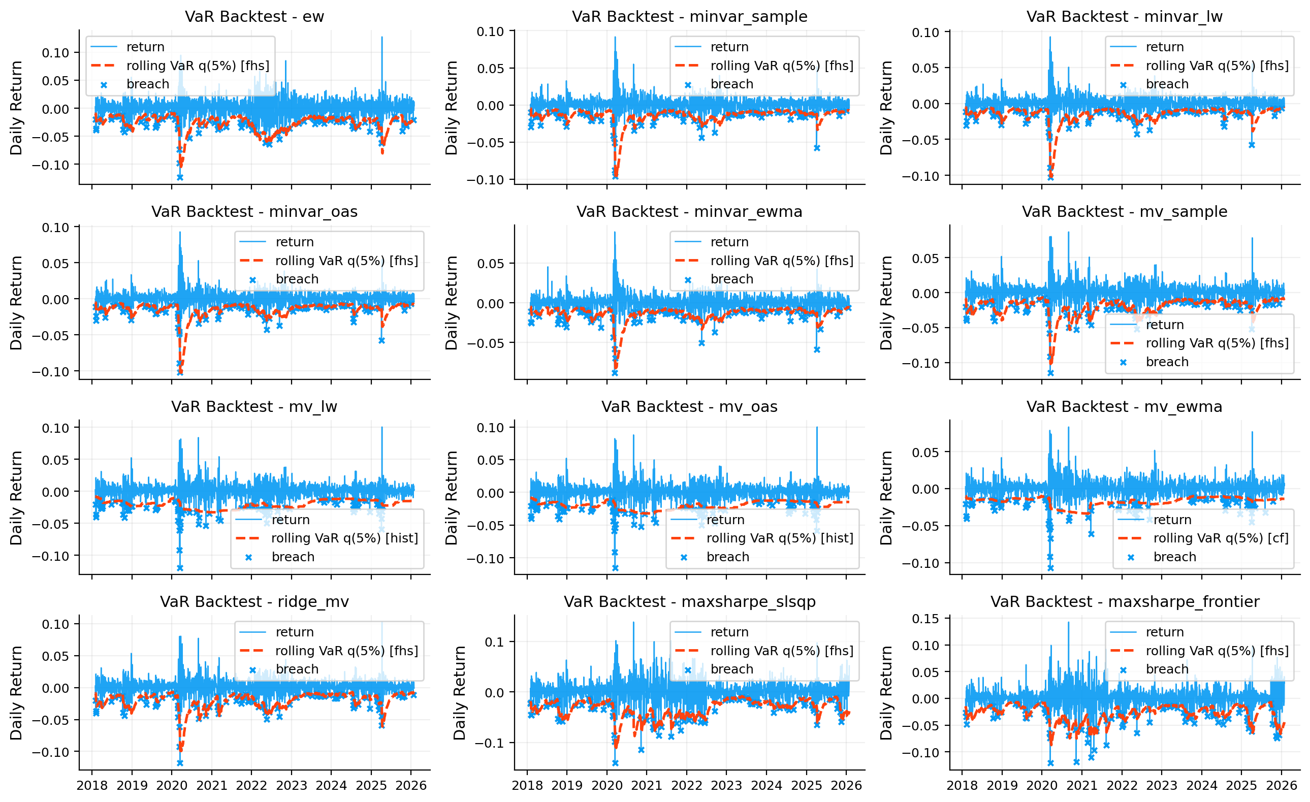 - Potential VaR model instability (p<0.05): minvar_ewma, minvar_oas.