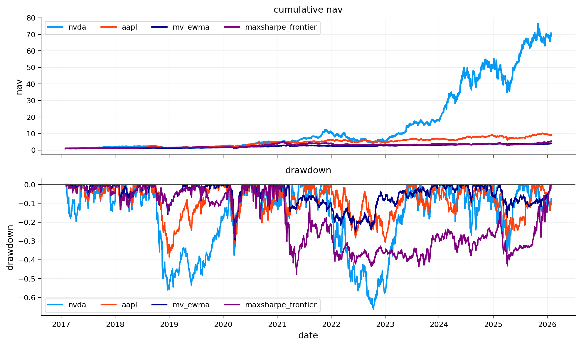 - Least severe maximum drawdown: minvar_ewma (-27.09%).